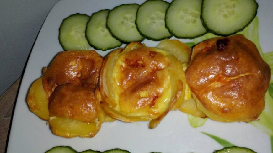 Отдолу на формичките наредих по един резен картоф и след това наредих отстрани още резенчета картофи. Страничните резенчета картофи гледах да ги застъпя леко, за да не може да излезе сместа.