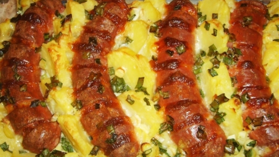 Наденицата се обелва от ципата, Правят и се прорези, в които се слагат парчета кашкавал, и се подрежда в тава на разстояние една от друга.Картофите се нарязват на кръгчета и се подреждат стъпаловидно между парчетата наденица. Заливат се с разбитите яйца и отгоре се посипва с нарязания зелен лук. Поръсва се с няколко лъжици олио.Ястието се поставя на средната скара на фурната и се пече на 180С докато се зачерви.От продуктите се получават 4 порции.