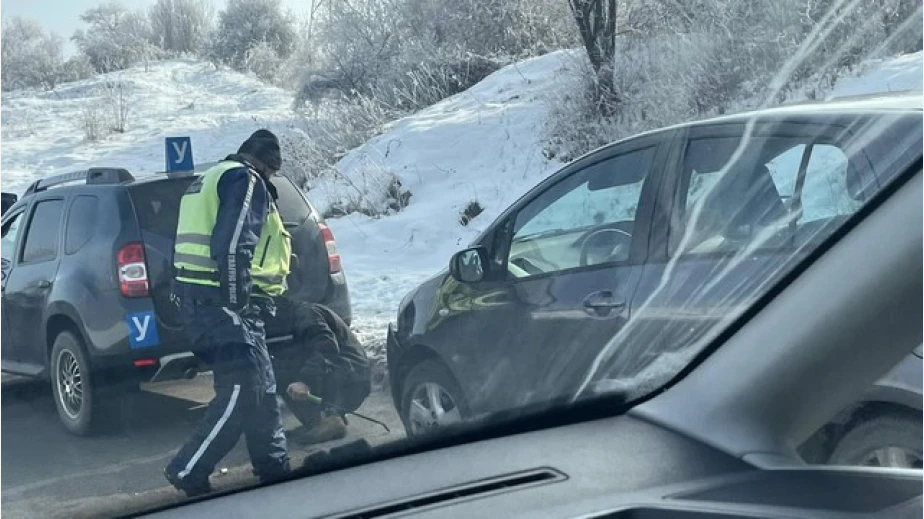 Катастрофата е станала между учебния автомобил „Дачия Дъстър“ и „Тойота Ярис“ в кръговото кръстовище. На място има полиция. Колите са в дясно на платното и движението не е затруднено, но е необходимо да се преминава с повишено внимание.