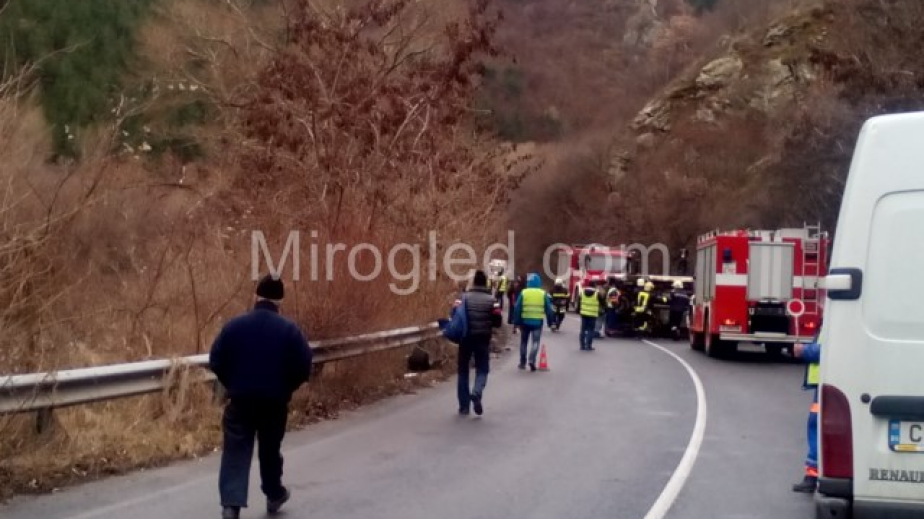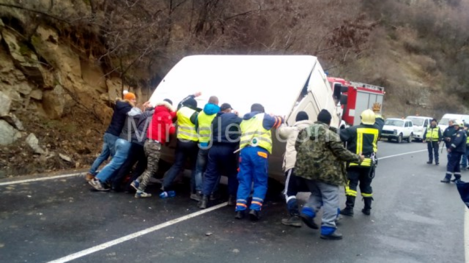 На място са пристигнали 2 противопожарни екипа, полиция и линейка. Мъже от попадналите в задръстването коли и пожарникари са изправили микробуса на ръце и са го отдръпнали от средата на пътя. По думите на очевидци загинали няма, но със сигурност има пострадали.