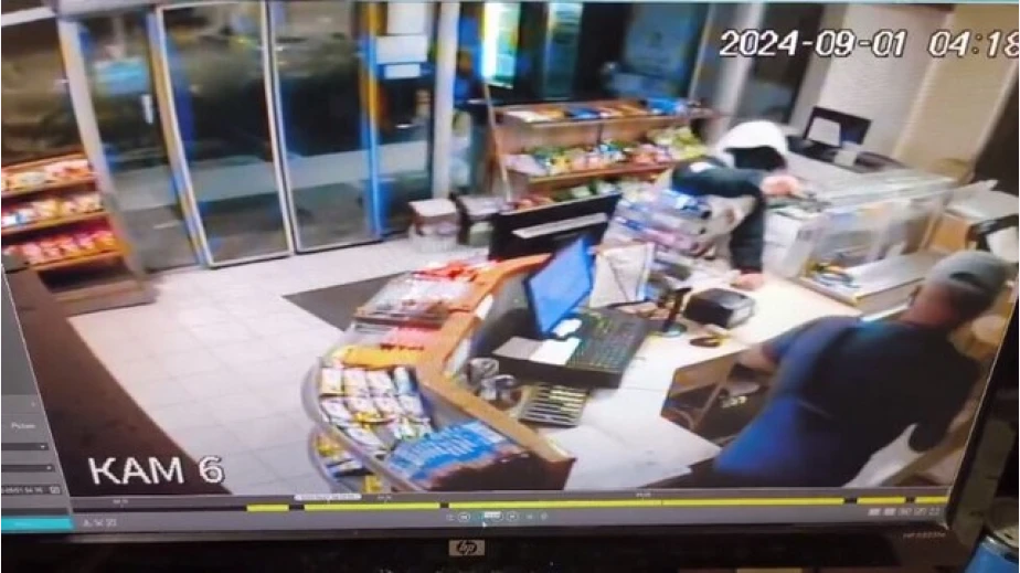 На записи от камери в бензиностацията се вижда как маскиран мъж, размахващ оръжие, нахлува в обекта, заплашва и удря по главата с пистолета служителя на смяна. След това заподозреният взема парите от дневния оборот и бяга. 57-годишният служител на обекта е с разкъсано-контузна рана на главата, вследствие на удар в тила с пистолета, посочват от полицията.