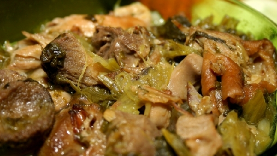 Нарязваме месото на хапки и го запържваме в олио или мас. Изваждаме го в чиния.В мазнината запържваме нарязаният праз. Прибавяме доматеното пюре, подправките и нарязаните зелени домати. Наливаме малко вода и виното и връщаме месото.Оставяме на бавен огън докато остане на мазнина.Поръсваме със ситно нарязан магданоз.