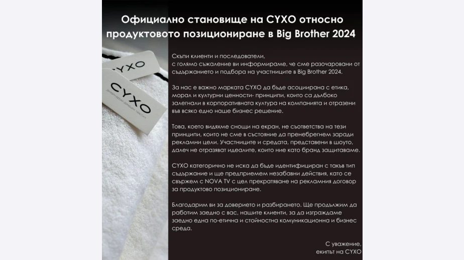 CYXO категорично не иска да бъде идентифициран с такъв тип съдържание и ще предприемем незабавни действия, като се свържем с NOVA TV с цел прекратяване на рекламния договор за продуктово позициониране.