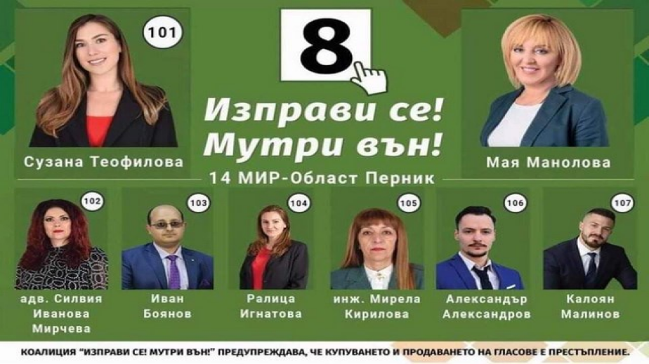 За кандидатите от листата за област Перник председателят на Коалиция “ИЗПРАВИ СЕ! МУТРИ ВЪН!” Мая Манолова казва: “Това е една от най-младата ни листа. Кандидатите ни за Перник са подготвени и доказали се млади хора, в сферите, в които работят. Радвам се, че сме един екип.”