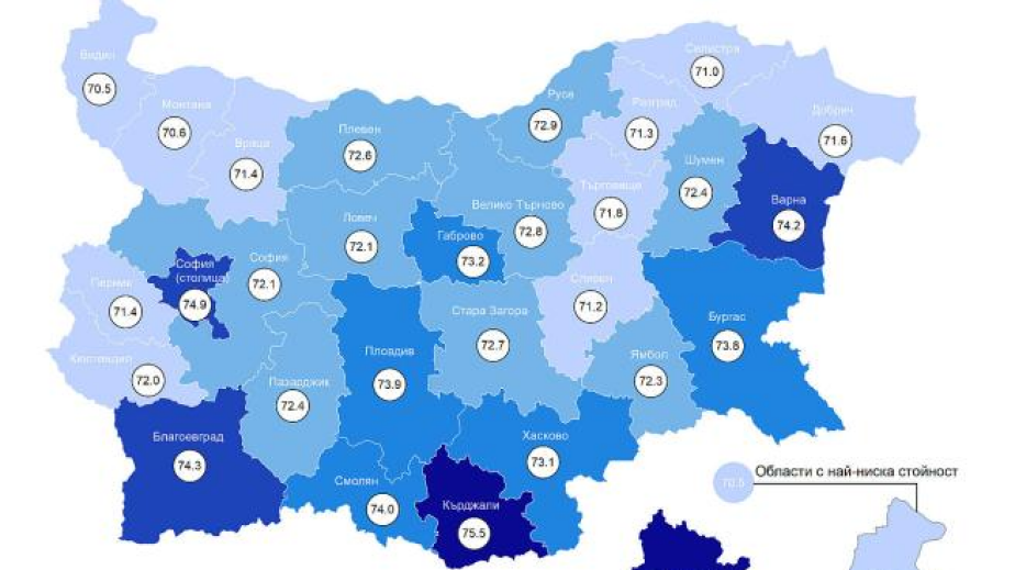 Най-малка продължителност на живота имат във Видин и Монтана, съответно 70,5 и 70,6 г. А най-висока - в Кърджали /75,5/, София /74,9/, Благоевград /74,3/ и Варна /74,2/. Във всички области обаче жените живеят по-дълго от мъжете.