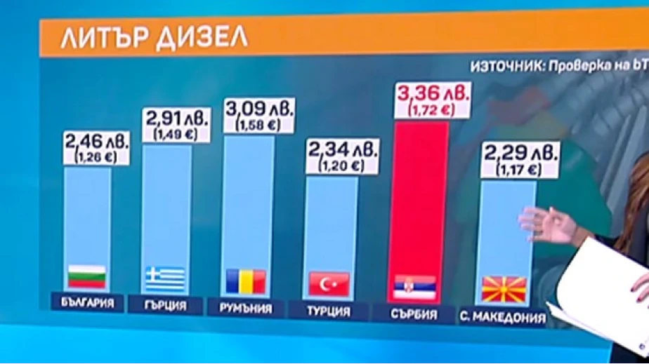 Най-скъп дизел плащат хората в Сърбия - 3.36 лв. за литър дизел, в Румъния – 3.09 лв., в Гърция – 2.91 лв., в България – 2.46 лв. Най-евтин дизел плащат хората в Турция – 2.34 лв. и в Северна Македония – 2.29 лв.