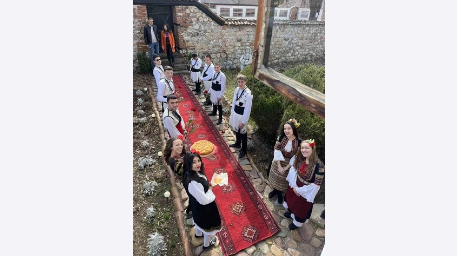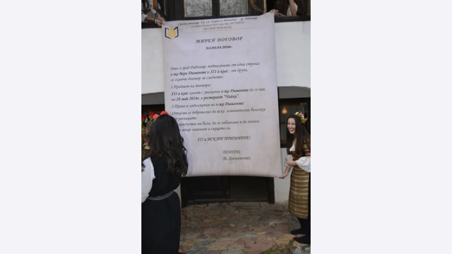 Зрелостниците подготвиха специална изложба на „Традиционно българско облекло“, която осъществиха в двора на музей „Стойова къща - Радомир“, със съдействието на служителите му и директора на училището – госпожа М. Ананиева. Всички бяха с народни носии, а класната бе посрещната с рози, питка и мед, и под звуците на гайди. След въпроса „Ще дойте ли с нас на бала?“, госпожа Диманова бе поканена да подпише „Мирен договор“ с определени клаузи.