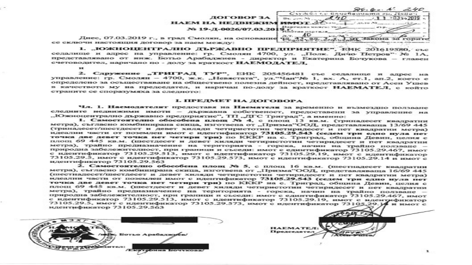Само ден по-късно Ботю Арабаджиев сключва договор с "Триград тур", с който отдава под наем три обособени площи. Те са в имот с трайно предназначение горска територия и начин на трайно ползване природна забележителност. Първият обект от 13 кв. м е даден под наем за 2,20 лева на месец. Вторият, с площ 16 кв. м, е даден за 2,60 лева месечно, а третият е 107 кв. м и наемът му е 6,70 лева на месец, което е средно между 8 и 9 стотинки на квадрат.