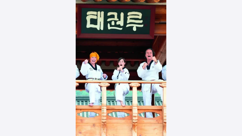 Княгиня Калина, Симеон Хасан и Китин в Таекуондоуон (Муджугун). Младият принц спечели зеления колан в Корея през 2023 г. /Източник: Хотарена