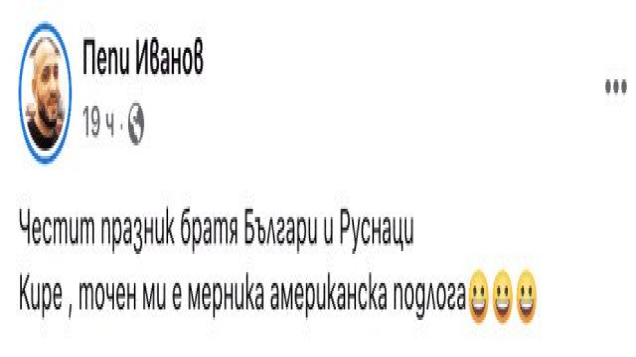 “Кире, точен ми е мерникът, американска подлога”, пише във Фейсбук младежа, който е изявен симпатизант на партия “Възраждане” и демонстративен русофил. Русенецът се изявява и като ММА боец, а като такъв ползва прозвището Пепи Питбула. Приятелите му в социалните мрежи побързаха да го поощрят след хвалбата му, че именно той е уцелил със снежна топка Кирил Петков. “Като видях, че си там и после тази топка, веднага казах: "Браво, Пепи!" Вътрешно усещане”, пише негов познат. Друг пък стигна по-далеч и го попита: “Що не го фраснахте и с кожена топка?”.