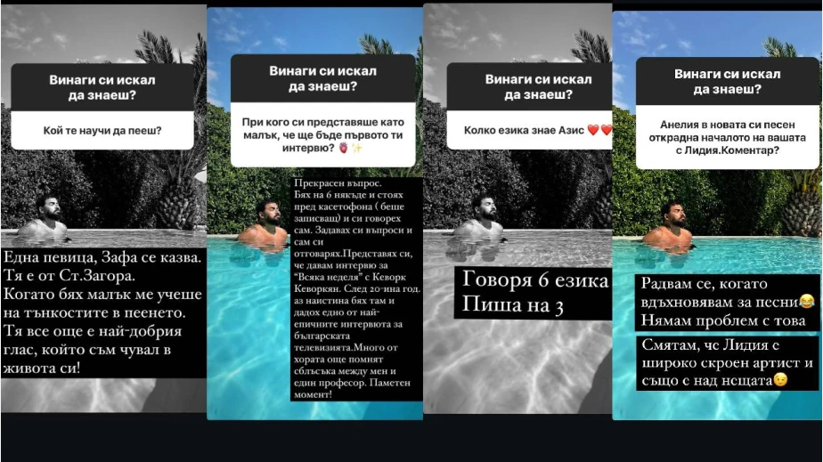 Той разкри още коя детска мечта е успял да сбъдне. Като малък взимал сам интервюта със себе си, записвайки се на касетофон и си представял, че седи на стола в предаването "Всяка неделя". 20 години по-късно застанал наистина лице в лице с Кеворк Кеворкян. А интервюто си Азис определя като едно от най-епичните в ТВ ефира ни.