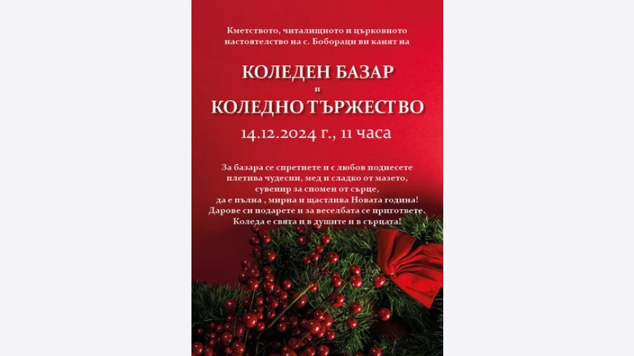 Коледен базар и коледно тържество ще се състоят днес в радомирското село Бобораци. Организатори са кметството, читалището и църковното настоятелство.