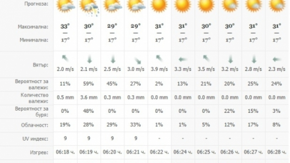 Със 7-8 градуса по-поносимо ще е по Черноморието, където термометрите ще показват 32-33 градуса. Дори морската вода няма да става за разхлаждане, защото температурата ѝ ще е 28 грудуса.