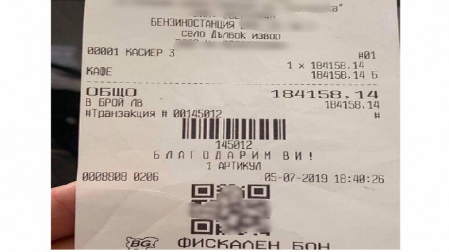 Мъж получи крупен фискален бон за покупката си на кафе от бензиностанция в пловдивското село Дълбок извор. Според издадената бележка напитката би струвала 184 158,14 лева.