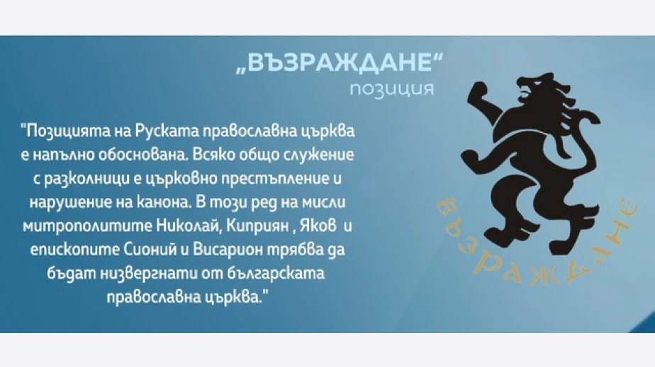 "Руската патриаршия реши да прекрати общението с петима български архиереи (трима митрополити и двама епископи) заради тяхната обща служба с украински разколници в Цариград. Официалната позиция на "Възраждане" по този повод е, че тези митрополити и епископи трябва да бъдат низвергнати заради нарушаването на църковните закони и опита им да унищожат независимата българска църква, подчинявайки я на фанариотите от Вселенската патриаршия.", написа Костадинов в профила си в социалната мрежа Фейсбук.