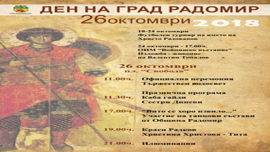 Богата програма за празника на града в Радомир. Мероприятията по повод Димитровден стартираха още на 18-ти октомври с футболен турнир на името на Христо Радованов.В него участие взеха ученици от всички училища на територията на община Радомир.