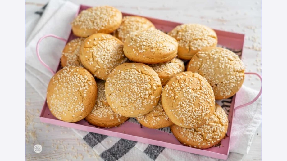 Поръсете курабийките със сусам и ги изпечете в предварително загрята на 180 градуса фурна до златист загар. /Рецепта на matekitchen.com