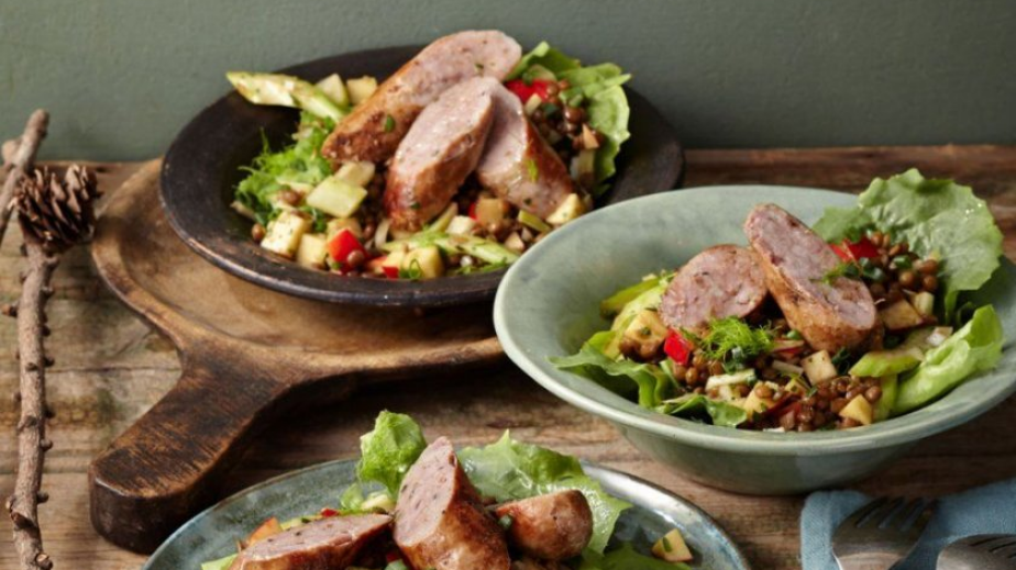 Сосът се смесва с ябълката, лещата, целината, фенела, магданоза, сол и черен пипер. Прибавя се зелената салата и се разбърква.
