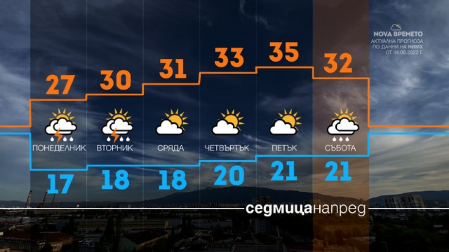 Следобедни летни валежи ще има и във вторник, но на малко места в Западна и Централна България. От сряда нататък следват няколко дни без валежи и с повече слънце. Температурите ще се повишават и ще догонят летните нива около и над 30 градуса. Към края на седмицата в традиционно горещите точки на страната ще е горещо с температури над 35 градуса. Едва през следващия уикенд ще премине студен атмосферен фронт с летни гръмотевични бури и валежи. /Източник: Нова ТВ