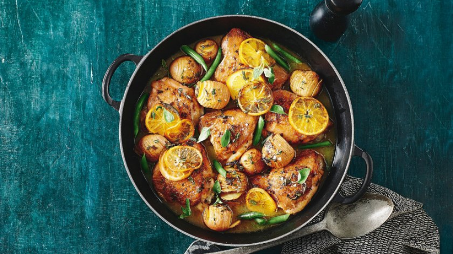 Подсушените пилешки бутчета се подправят със сол и черен пипер. Лимонът и портокалът се нарязват на тънки кръгчета. Обеленият джинджифил се нарязва на дребно.