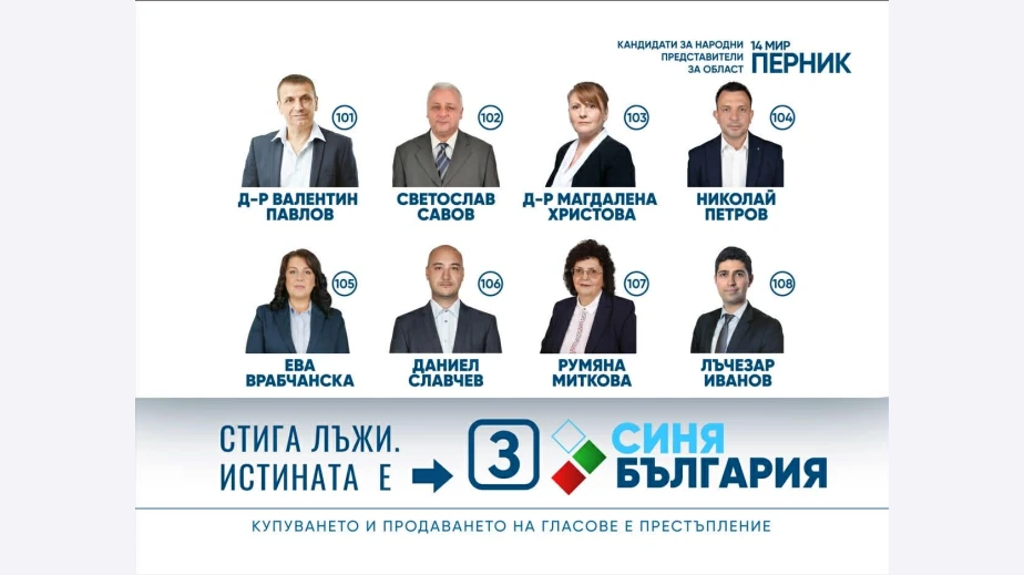 Листата на Синя България за област Перник, обединява личности с разнообразен професионален опит, експертиза и активна гражданска позиция. Всеки от тях носи своите знания, своя път и своята лична кауза, но всички са обединени от една обща цел – да работят за развитието на Перник и България чрез реални решения, почтеност и последователна политика.