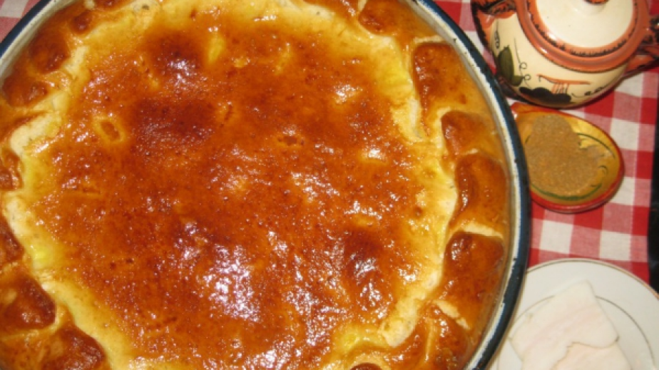 Замесете тесто от изброените продукти. Оставете да втаса, докато удвои обема си. Разделете на две части, а едната - на още две малки. Разточете голямата топка на кора и я поставете в намаслена тава (кората трябва да е по-голяма от тавата, в която ще се пече).