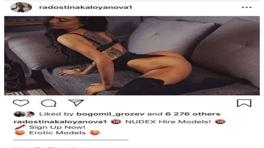18-годишната бивша гимнастичка Радостина Калоянова за пореден път взриви обществото с разкрепостеното си държание. Брюнетката, която бе сравнявана с Николета Лозанова, публикува пикантен фотос, от който се разбира, че е станала еротичен модел.