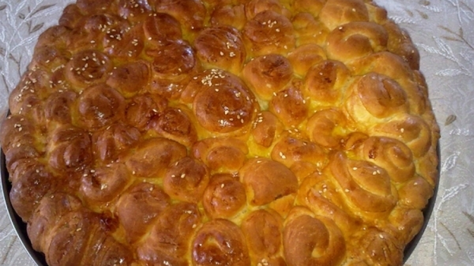 Замесваме тесто от пресятото брашно, киселото мляко, маята която предварително разбиваме в 50 мл. топла вода и яйцата. След това оставяме тестото да втаса за около 50 мин. на стайна температура (или докато увеличи обема си 1 път и половина).След като тестото втаса разтопяваме на микровълновата маслото разделяме на 5 -6 равни топчета тестото, след това всяко топче разточваме на правоъгълник и всеки правоъгълник мажем с разтопено масло. После режем на лентички правоъгълника, който навиваме като охлювчета и нареждаме в кръг около предварително намазнена тавичка.След като сме разточили всички топчета и сме наредили тавичката оставяме отново да втасва докато се изпълни до ръбчето тавичката.Пет минути преди да печем намазваме погачата с разбития жълтък и поръсваме с сусам.Печем на предварително загрята фурна на 200 градуса за около 20 мин (докато се получи червеникав цвят ).