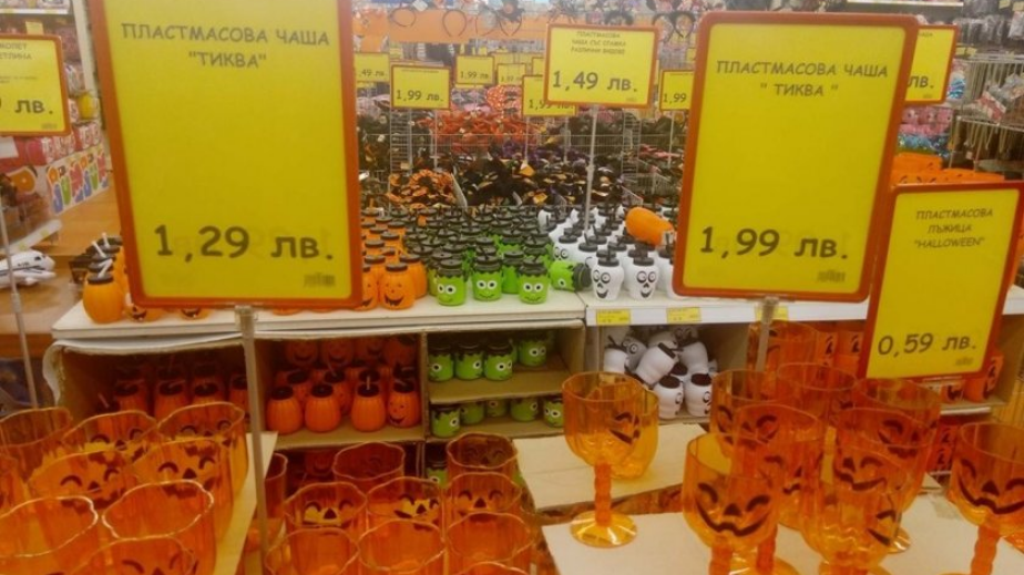 Почитателите на Вси светии може да украсят екзотично дома си със силиконов призрак за 2,49, или мека топка паяк за 2,99. Символът на празника - тиквата, се предлага във всякакви варианти - от най-малките до най-големите във вид на украшения, чаши или поставки за фенери. Пластмасови чаши- тикви може да намерите за малко повече над левче - има ги на цена от 1,29 до 1,99.
