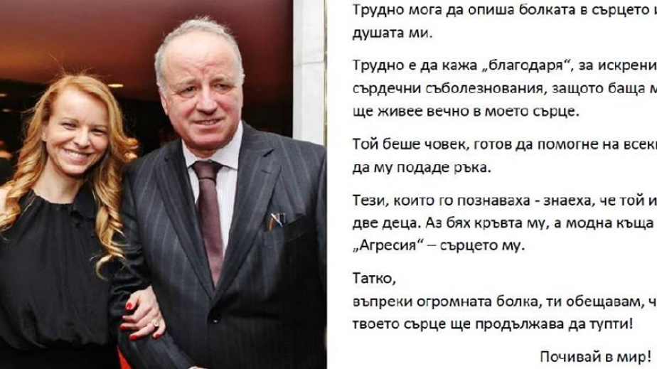 "Трудно ми е да опиша болката в сърцето и душата ми. Трудно е да кажа благодаря за искрените и сърдечни съболезнования, защото баща ми ще живее вечно в моето сърце. Той беше човек, готов да помогне на всеки и да му подаде ръка. Тези, които го познаваха, знаеха, че той има две деца. Аз бях кръвта му, а модна къща "Агресия" - сърцето му", заявява дъщерята на една от най-големите модни компании в България.