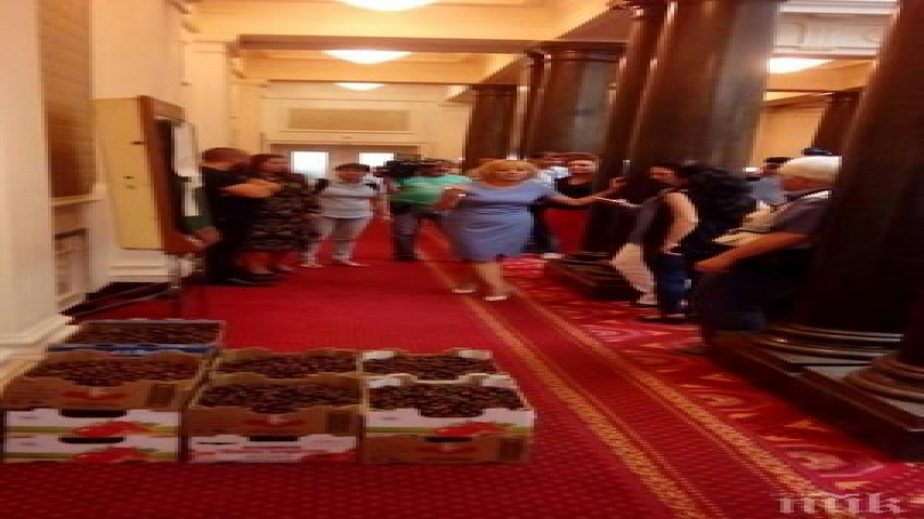Черешовото надяждане в парламента продължава. Макар и изпреварена от кюстендилския депутат Кирил Калфин от ГЕРБ, омбудсманът Мая Манолова, която също е от Кюстендил, спази традицията от депутатските си времена и донесе в парламента 10 кашона череши - хрущялки.