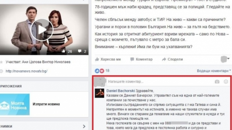 „Здравейте, казвам се Даниел Бачорски. Управител съм на една от най-големите компании за почистване у нас. Изписвам състраданието си спрямо ситуацията с г-жа Гатева и сина й. Неприятен е моментът на истината, а именно че такива случаи има много. Винаги се стараем да помагаме на наши служители в нужда и тук ще предложа помощта ни. Нека госпожата се свърже с мен на 088* *** *** и да се представи и това, което мога да предложа е постоянна работа и сигурно и навременно заплащане”.