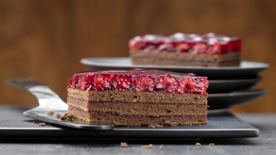 Загрява се леко малиновото желе и се намазват блатовете. Подреждат се един върху друг. Отгоре се подреждат малините.