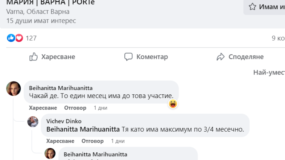 Няма желаещи заведения, които да искат Мария да забавлява гостите им и да „извие” плейбек. Проверка на „Уикенд” показа, че дребното миньонче може да се похвали с едва две участия за цяло лято. Заралийката широко рекламира изявите си още от началото на юни. Първата е насрочена за 7 юли в Пазарджик, а втората е на 14 юли във Варна. „Чакай малко, де. То има един месец до това участие, много отрано го рекламираш” – пише последователка на Мария в социалната мрежа и се залива от смях. Други допълват, че е нормално да промотира изявите си за след месец, защото няма по-скорошни и не е желана от клубовете.