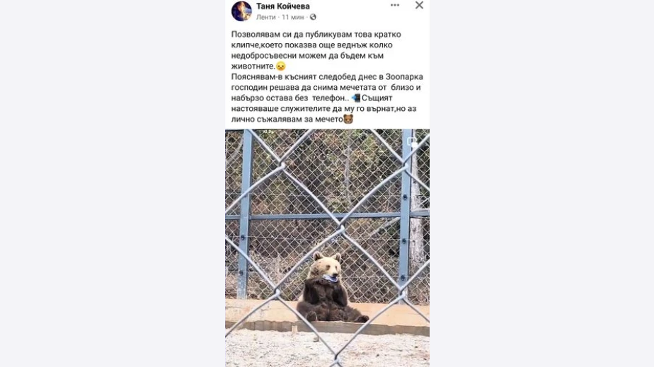 Мечка взе телефона на мъж, опитал се да я снима отблизо в зоопарка в Стара Загора, пише Lupa.bg