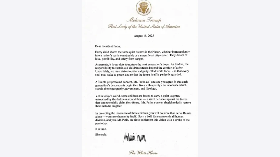 Fox News Digital разкрива, че в писмото си Мелания Тръмп отбелязва, че е дошло времето да се защитят децата и бъдещите поколения по целия свят. Известно е, че Путин го е прочел пред представители на американската и руската делегации веднага след като го е получил, уточняват от Fox News Digital.