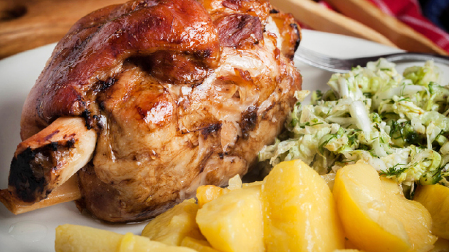 Оставете месото в хладилника за 3 часа да се маринова, извадете и преместете джолана в тава. Сипете половината от останалата марината около джолана и долейте бульона.
