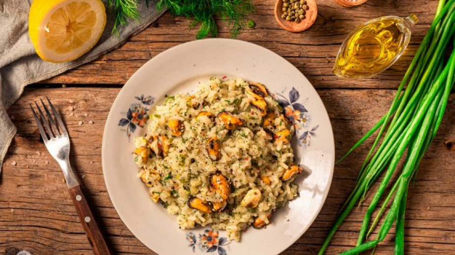 Поднесете топлите миди с ориз по гръцки поръсени с прясно изцеден лимонов сок и лютив пипер. /Рецепта на matekitchen.com