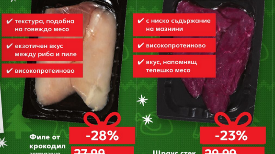 Щраусовото месо е намалено с 23% и в малка разфасовка излиза на цена 22.99 лв., а филето от крокодил е с намаление от 28% и струва 19.99 лв.
