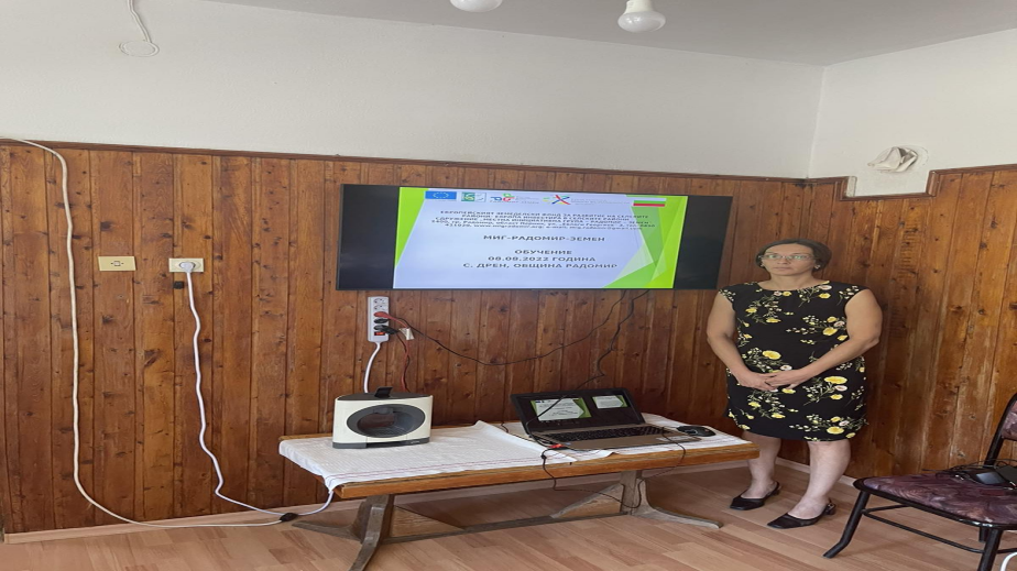 На проведеното 8 август 2022 г. в НЧ „Благой Попов – 1927 г.“, с. Дрен, община Радомир, обучение присъстващите участници бяха запознати с възможностите за модернизиране на технологичната база и внедряване на иновации в специфични за територията предприятия от хранително-вкусовата промишленост, чрез подготовка и кандидатстване с проектни предложения в ИСУН 2020 по мярка 4.2. „Инвестиции в преработка/маркетинг на селскостопански продукти“ от Стратегията за ВОМР на МИГ.