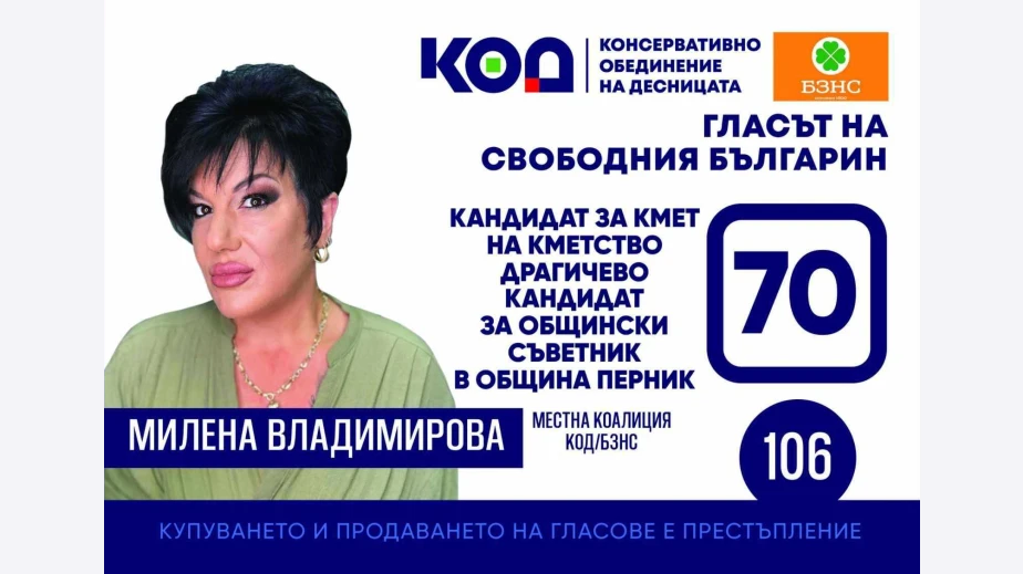 Местна коалиция „КОД“/БЗНС/ има ентусиазма, последователността и увереността в лицето на своя кандидат за кмет на кметство Драгичево - Милена Владимирова.