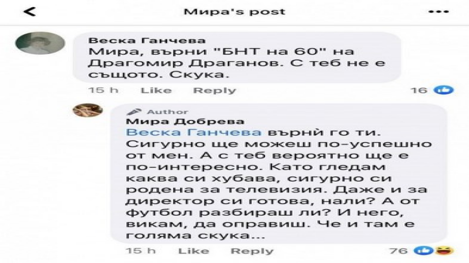 С това обаче не се изчерпва нервният ѝ изблик. Друга фейсбук потребителка на име Милена Радославова също решава да изрази мнението си, без да пудри егото на журналистката със суперлативи, каквито тя явно единствено иска да чува за себе си. „Не се сърди, но наистина не си за това предаване „БНТ на 60“. Разбери го! Не изпращай нас, ние си имаме с какво да се занимаваме!“, пише тя. Добрева обаче не ѝ остава длъжна. „Ръководството на една медия решава кой водещ къде да бъде изпратен. Никой не може да се самопостави на екран. Ако можехте, такива като вас щяха да са най-отпред. Защото аз може да не съм за това предаване, а вие непременно сте, нали? И ако имате с какво да се занимавате, защо се занимавате с мен? Я, марш оттук!“, агресира журналистката срещу коментаторката.