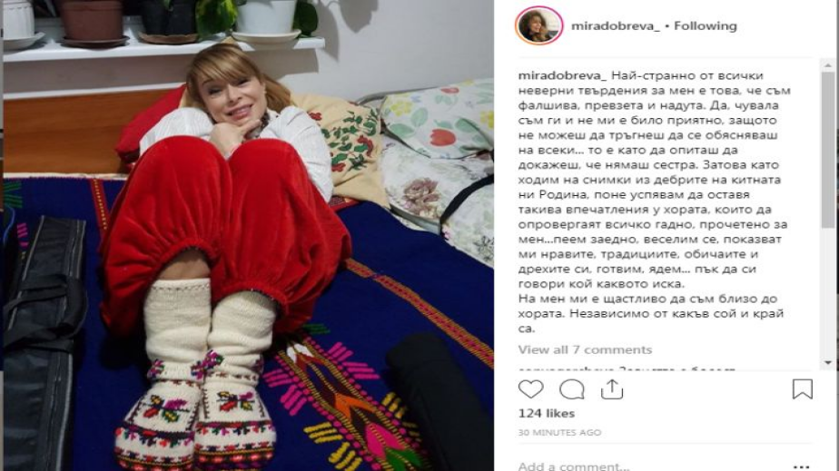 „Най-странно от всички неверни твърдения за мен е това, че съм фалшива, превзета и надута. Да, чувала съм ги и не ми е било приятно, защото не можеш да тръгнеш да се обясняваш на всеки... то е като да опиташ да докажеш, че нямаш сестра. Затова като ходим на снимки из дебрите на китната ни Родина, поне успявам да оставя такива впечатления у хората, които да опровергаят всичко гадно, прочетено за мен...пеем заедно, веселим се, показват ми нравите, традициите, обичаите и дрехите си, готвим, ядем... пък да си говори кой каквото иска.