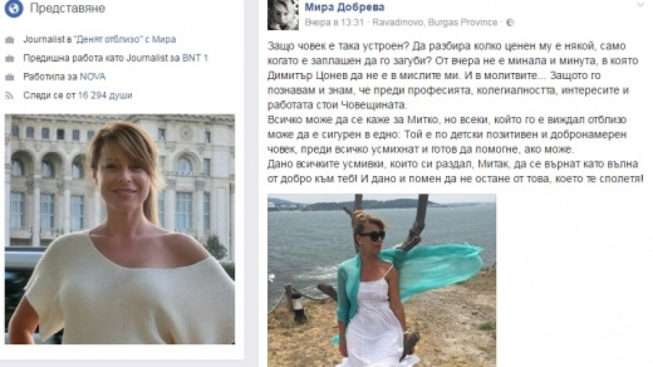 Водещата Мира Добрева публично показа отношението си към внезапно покосения от инсулт Димитър Цонев. Журналистката е на почивка в Равадиново, но веднага се включи в личната си фейсбук страница, където написа:"Защо човек е така устроен? Да разбира колко ценен му е някой, само когато е заплашен да го загуби? Не е минала и минута, в която Димитър Цонев да не е в мислите ми. И в молитвите...