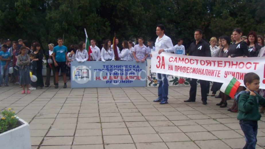 Всички педагози и ученици носеха лентички с надпис „За самостоятелност на професионалните училища в Радомир”. Имаше и трансперант, който гласеше същото.