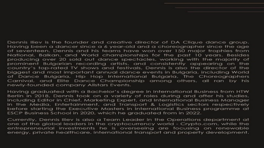 Денис Илиев е основател на пернишката хип-хоп формация DA Clique. Занимава се с танци от 6-годишен, а на 17 вече изготвя и хореографии. Младият мъж има над 150 спечелени големи награди от национални, балкански и световни изяви и е продуцент на над 20 танцови спектакъла с изключително голям рейтинг.