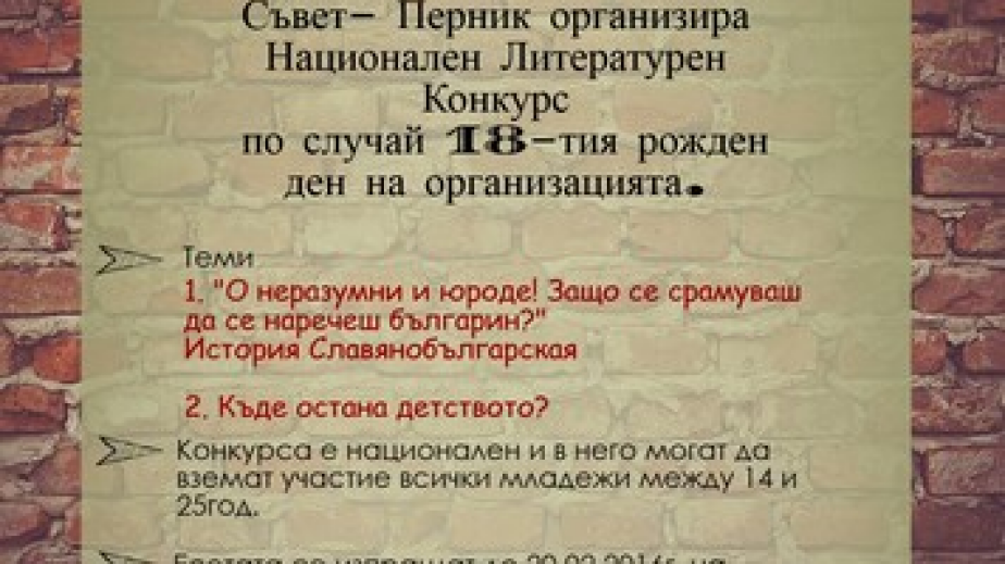 Общински младежки съвет в Перник организира Национален Литературен Конкурс по случай 18 си рожден ден. В конкурса могат да участват всички младежи между 14 и 25 години. Темите за есетата са: "О неразумни и юроде!Защо се срамуваш да се наречеш българин?" и "Къде остана детството?". Обемът на есето трябва да е до 3 страници в Word, шрифт - Times New Roman и Font Size – 12. Есетата могат да се изпращат до 20.02.2016 на omc.pernik@abv.bg или на адрес гр.Перник 2300; пл.Кракра Пернишки1; ОБМД. Наградите са ваучери за книжарница "Ирида". Те ще бъдат на стойност за 1-во място 100лв.; 2-ро място-75лв.; 3-то място-50лв. Награждаването ще бъде на 3 март, когат е и рожденият ден на неправителствената организация.