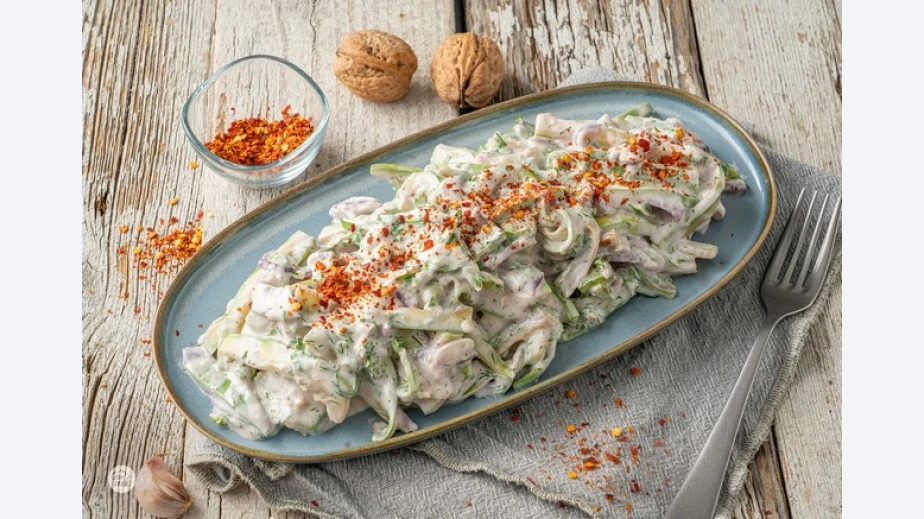 Салата от печени чушки и орехи върху краставица