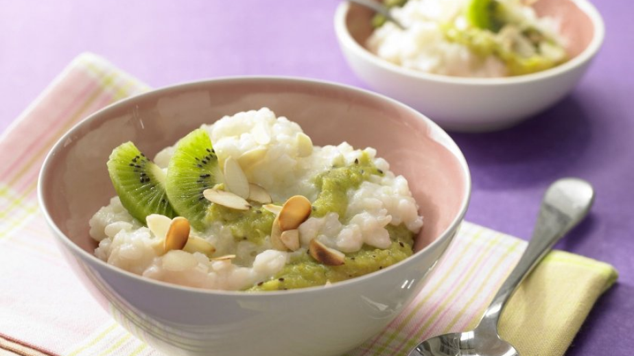 Добавя се медът в млякото с ориз и се разбърква. Полива се с киви пюрето.