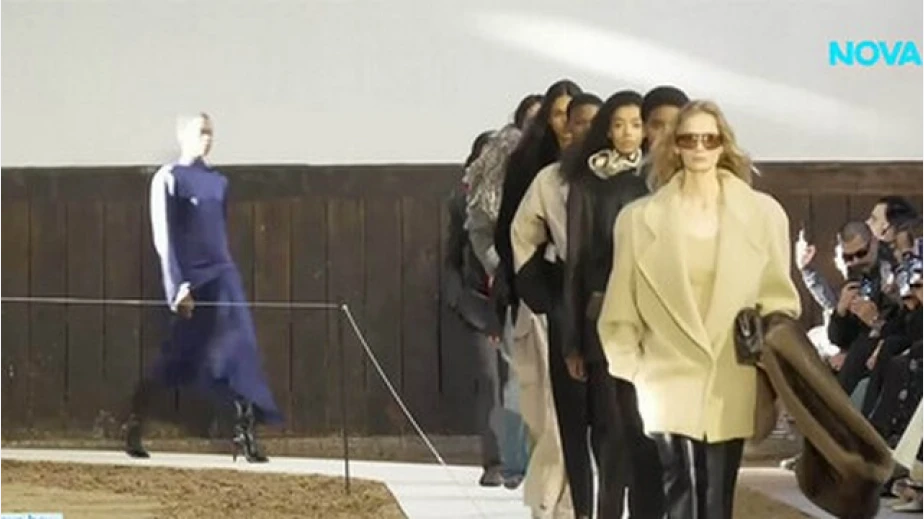 Там 10 жребци – 5 черни и 5 бели – изпълниха специална хореография на пясъчната арена, преди на подиума да се появят моделите. Зимната колекция 2026 е вдъхновена от конния спорт – с високи ботуши за езда и панталони със стремена.